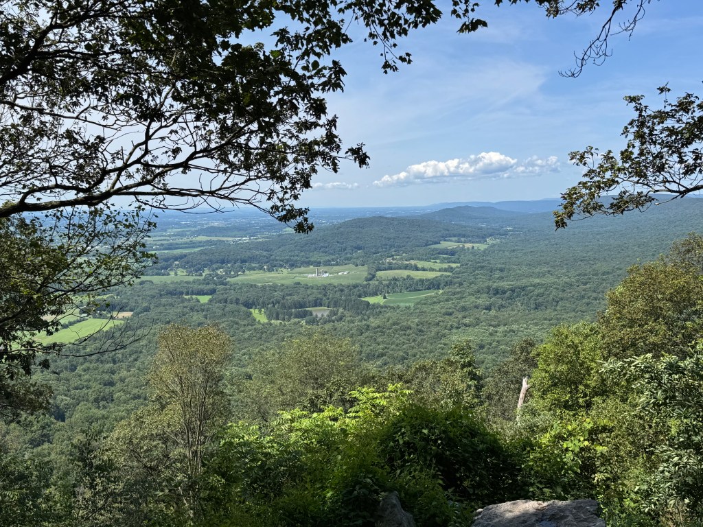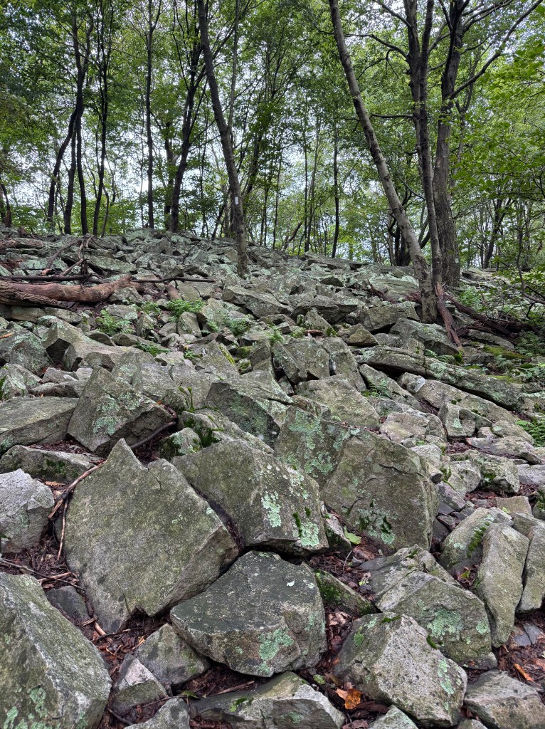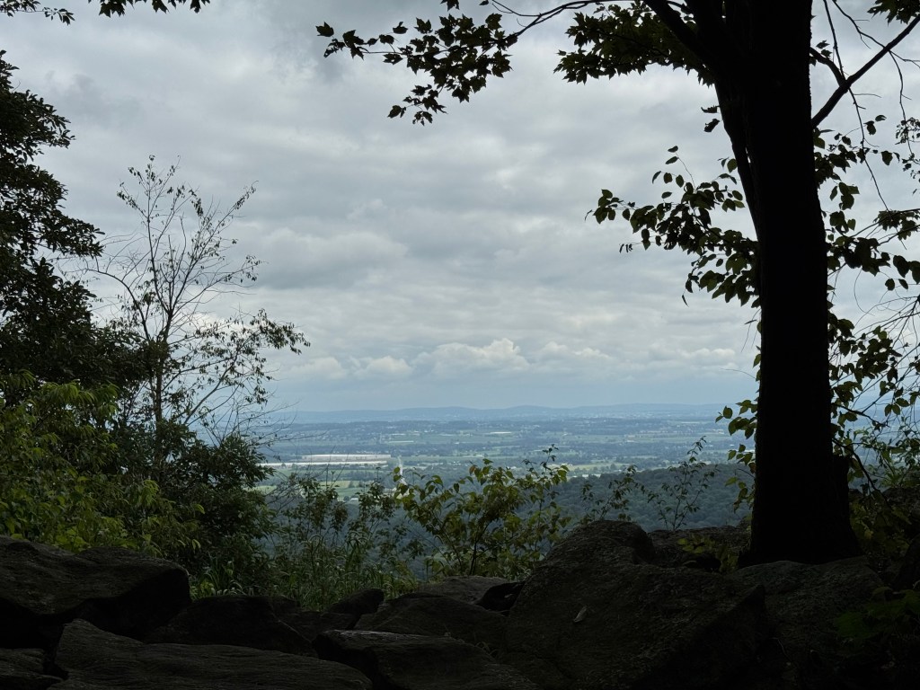 As I make my way, there are two overlooks noted on my trail app. Both of them offer views of the PA valleys but I keep my distance from the edge of the rocks, knowing that copperheads have been nesting there recently. (I read it in the app.)