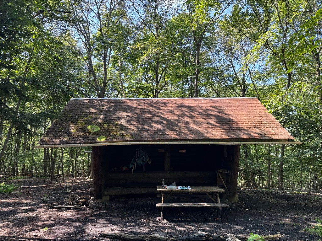 I’ve arrived at the shelter where I planned on spending the night but… it’s too early to stay here. Because of my anxiety, I insisted on leaving early and so, by midday I’ve gotten to my destination, a shelter down a steep hill that is boxed in with forest and no view. There are no tenting spots right at the shelter. The tenting spots are back up the hill on the other side of the trail on the path down to the spring. If I stay here and camp, I’ll likely be alone. That doesn’t sound fun.
