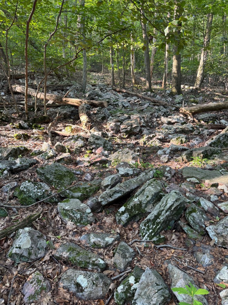 The steep descent led through the floor of a micro-canyon and to a place called “Devil’s Graveyard, ” a boulder field of some notoriety in Berk’s County. I know that this is the name because another hiker that I passed wearing converse sneakers and with no pack and no apparent water, was standing off of the side of the trail acting a little weird. (maybe I came up on him as he was peeing). He asked where I was headed (not a question that solo female hikers ever answer truthfully) and he said that if I were going to the Devil’s Graveyard, he would come along. I kept moving and kept my head down. When I got to Devil’s Graveyard, I made a sharp turn and continued to the campsite for the night.