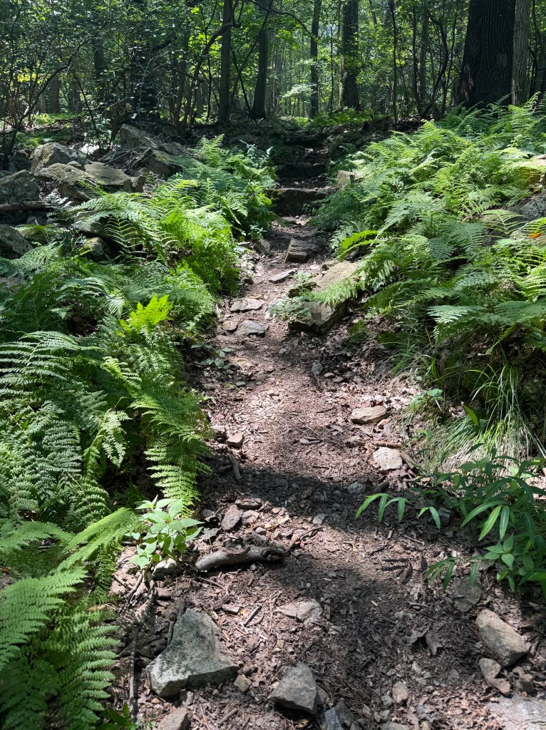 I carried on through some lovely sections of trail that included more fern fields and, then, a burn field- a place where the trees had burned and only the undergrowth was yet growing back. This was in the heat of day – and the sun was shining- and each scary rock was now obscured by grass and ferns. (When I remarked on this later to a companion at the shelter, she said, “Oh, wasn’t it nice to be out in the open!”) Yes, it was. And, the hidden rocks persisted for at least 2 miles.