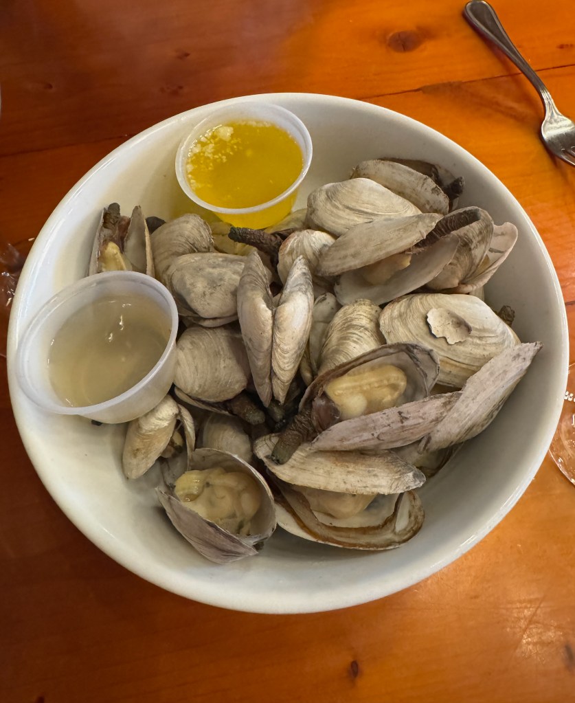 A big part of any trip, for me, is exploring the local cuisine and eating what the land (or sea) has to offer. When most people go to Maine, lobster is at the top of their “must eat” list. For me, it is steamed clams. My mother used to tell a story of how, on the summer just before my first birthday, I took my first wobbly steps (in South Harpswell) and also ate my first steamed clam. I guess, back then, parents didn’t worry about things like shellfish allergies. I must have had enough teeth to manage the rubbery black neck, or siphon, of the clam and the attached “belly,” full of briny, soft, clammy-goodness. (I am at a loss for words of how to describe, exactly, the taste of a clam.). As I grew, summer by summer, I learned the ritual of extracting the clam from the shell, slipping the neck from its papery covering, swirling the clam around in the cup of broth provided at the table, dipping it again, this time in melted butter, and then getting the whole clam into your mouth without dripping butter all over the front of your shirt. (Lobster eaters are often given big, infantilizing paper bibs to catch their drips. Clam eaters are better than that.). At the end of the steamer-session, you finish by carefully drinking the leftover broth, stopping just short of taking in the gritty, sludgy sand at the bottom of the cup. The broth tastes like the sea.