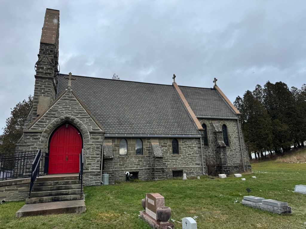 I love it here at “BRC.” The setting is bucolic. The retreat house sits at the edge of a country road with a gracious hill that rises up behind it to the woods. Just across the lawn and through a stand of cedar trees is the stone chapel (1889) which is in the “miniature gothic style” with red and white marble inside and butternut woodwork fashioned with wood from a nearby forest. The stained glass is mostly from Whippel in Exeter, England, and one of the figures in the window depicts the child of the founding father of the parish, Henry Hatch Dent. There is a graveyard that stretches out from the door of the church, and a long sloping field that is used by a local farmer to grow hay. (One time last summer the farmer and his kids were here while Glenn and I were visiting and we learned everything we now know about haying and farm machinery from their 8 year old boy.)