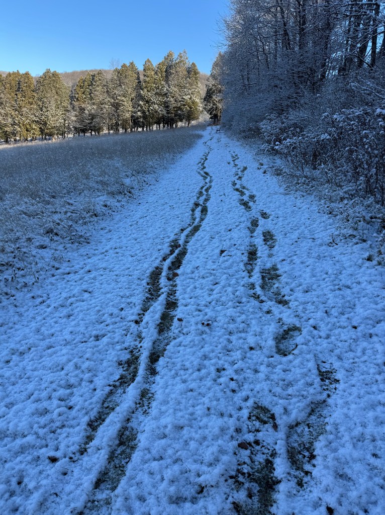 This morning I woke at dawn and was greeted by a moody sky and a fresh blanket of snow. Waiting for the coffee to finish brewing, I stood at the long windows in the dining room of the retreat house and watched for deer. The clouds moved quickly in the sky, promising that they weren’t going to hang around for long and, indeed, in just a couple hours’ time it was pure cerulean overhead.