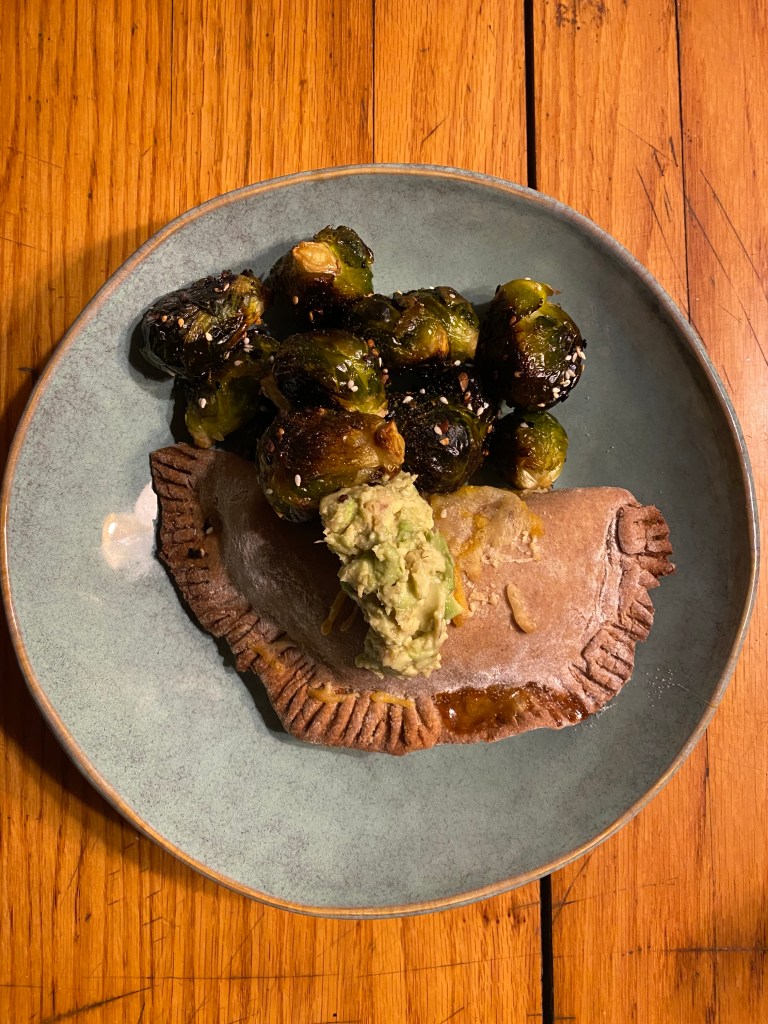 This week’s vegan adventures included dishes of the “stuffed and filled” category and, I would offer that they were not the best. I was inspired by the new Forks Over Knives mag for “Winter 2022” and made their black bean and corn empanadas and the tofu and vegetable momos with tomato chutney. Both the empanadas and the momos called for simple doughs but they lacked a certain grace and were each, in their own way, too heavy. I made the empanadas more like a calzone- one big filled pocket. The filling was good- corn, beans, jalapeños, red pepper and onion- but the whole affair was a little flat. The dough was tough and the filling cried out for some cheese. I mashed up some avocado with lemon and served that on top: