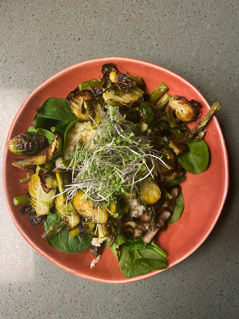 The winning dish of the week, though, was one that I threw together on a night when I had a late meeting. It was roasted green veggies on a bed of rice with spinach on the bottom and home-sprouted alfalfa on the top. Simple. Easy. Not pretending to be anything that it wasn’t. (that’s probably why I liked it.)