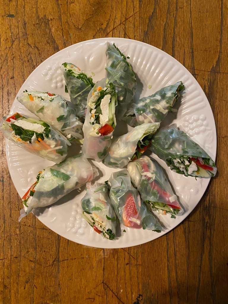 This week, for example, we enjoyed summer rolls. I shoved a whole lot of crunchy veggie goodness into some rice wrappers along with some tofu and we feasted on them, along with some delicious dipping sauces like Thai red chili sauce, peanut sauce, and tamari. I know… the sauces aren’t especially good for you but… everything in moderation?